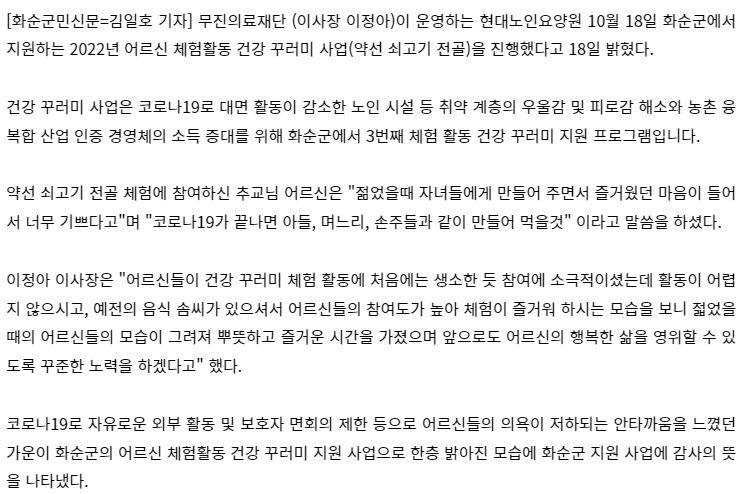 Çö´ë³ëÀοä¾ç¿ø "¾î¸£½Å üÇèȰµ¿ °Ç° ²Ù·¯¹Ì »ç¾÷" ÁøÇà .. ȼø±º Áö¿ø - ȼø±º¹Î½Å¹® (hwasunnews.co.kr)